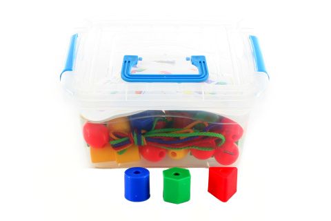 Plastové korále s tkaničkami na navlékání. Rozměr jednoho korálku cca 3 cm. Součástí je plastový box pro uskladnění. Velikost boxu ca 24 x 19 x 12,5 cm. Věk 3+