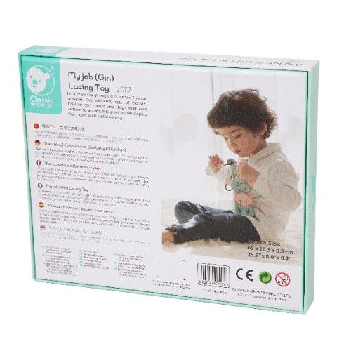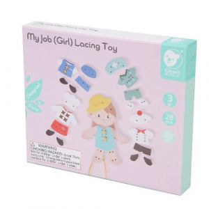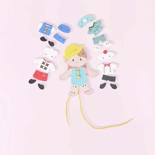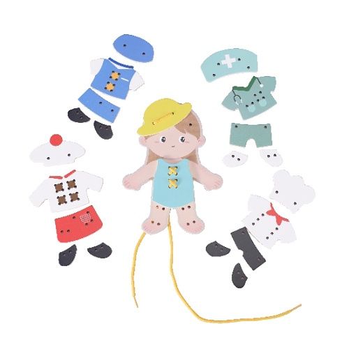 Tato dřevěná sada šněrovacích hraček obsahuje malou holčičku a pět různých sad oblečení na šněrování a oblékání. Pro děti je to zábavný způsob, jak si procvičovat koordinaci ruka-oko a rozvíjet svoji kreativitu při šněrování a kombinování outfitů. Upozornění: Obsahuje šňůru, hrozí nebezpečí uškrcení!