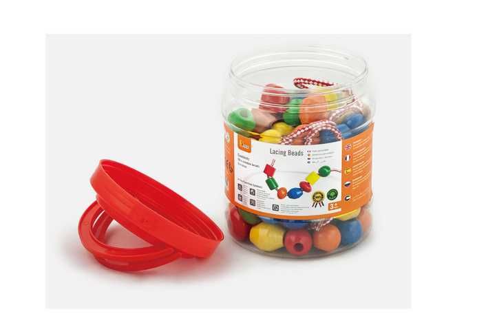 Opravdu velké dřevěné korálky a barevné tkaničky, na které lze korálky navlékat. Rozměr korálku je cca 3 x 3 cm, několik tvarů.