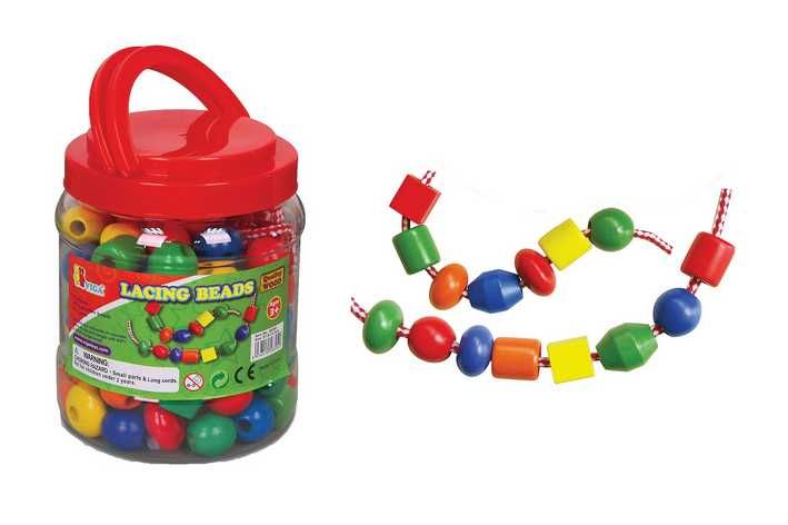 Opravdu velké dřevěné korálky a barevné tkaničky, na které lze korálky navlékat. Rozměr korálku je cca 3 x 3 cm, několik tvarů.