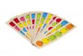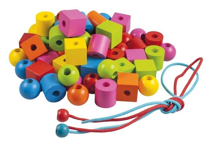 "Dřevěné maxiperle různých tvarů o průměru 20 mm se šňůrkou k navlékání a papírovými předlohami. Výrobek splňuje požadavky EU na bezpečnost hraček a je vhodný pro děti od 3 let."