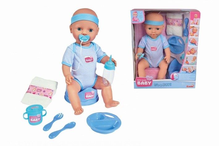 Panenka New Born Baby s plastovým tělíčkem, funkce pije a čůrá. Velikost panenky 43 cm. Součástí dudlík, nočník, plena, talířek s příborem a hrníček.