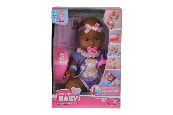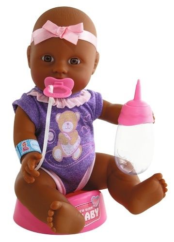 Etnická panenka s plastovým tělíčkem z řady New Born Baby s funkcí "pije a čůrá". Součástí 4 ks příslušenství: dudlík, lahvička, nočník a rodný list. Velikost panenky 30 cm.