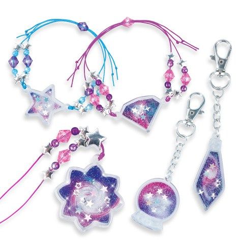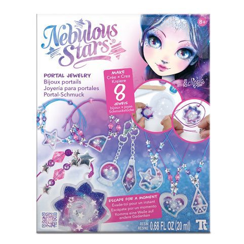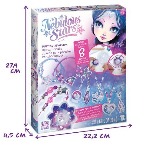 Nebulous Star Portálové šperky Eclipsia. 8 základů pro tvorbu šperku, 2x lahvička s pryskyřicí, nálepky, flitry, třpytivý prášek, nylonové provázky, 105 korálků, 2x háček, 2x zapínací kroužek, nádoba a tyčinka na míchání pryskyřice, rukavice na jedno použití, Eclipsiin příběh, pokyny.