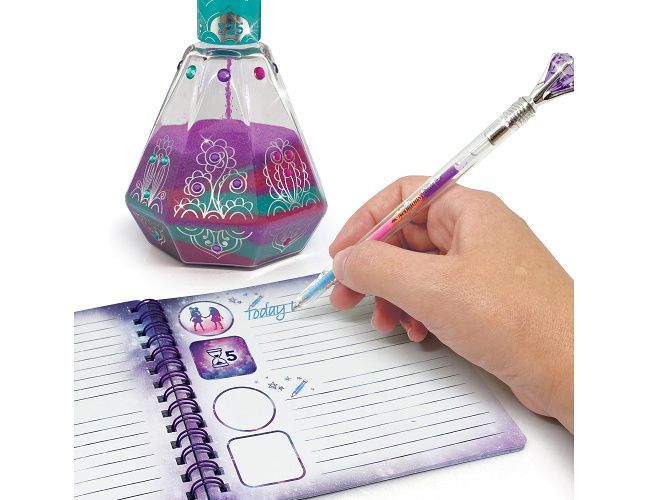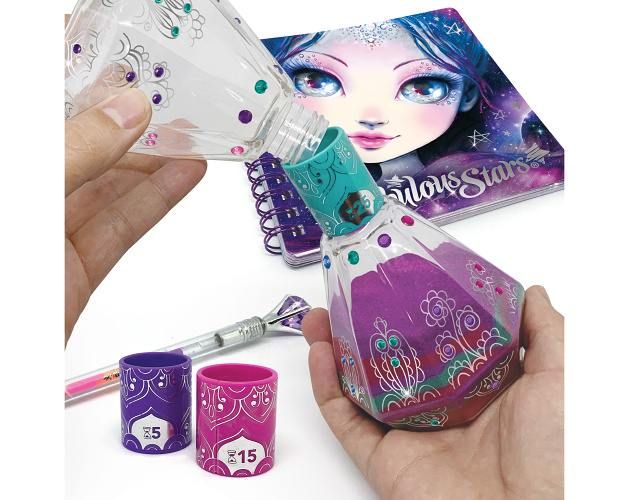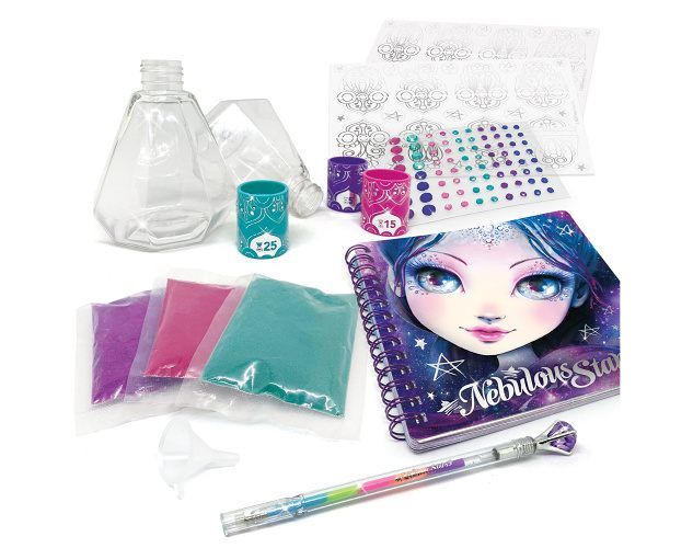 Obsah balení: 160 nálepek, nádoby na tvorbu přesýpacích hodin, barevný písek, duhové gelové pero, manuál