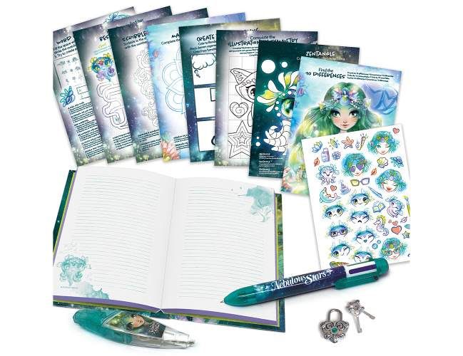 tajný deníček, 200 stran, 44 stran s úkoly, 1 barevné pero, 1 kouzelné pero, zámek s klíčkem