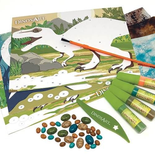 obsah: 3 dekorační tabulky, 3 listy foliového papíru, 4 tuby písku, akrylové kamínky, nástroj k přenesení kamínků, štětec, sběratelská kartička dinosaurů, barevné pokyny