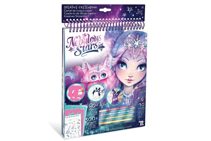 blok v kroužkové vazbě s 35 stránkami, více než 300 samolepek, 80 šablon, 1 arch s texturami, 5 oboustranných pastelek, 8 ukázek techniky kreslení
