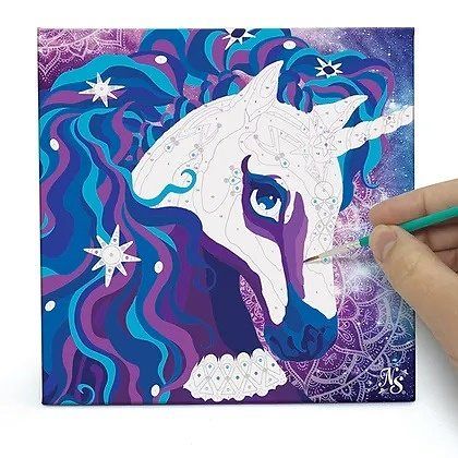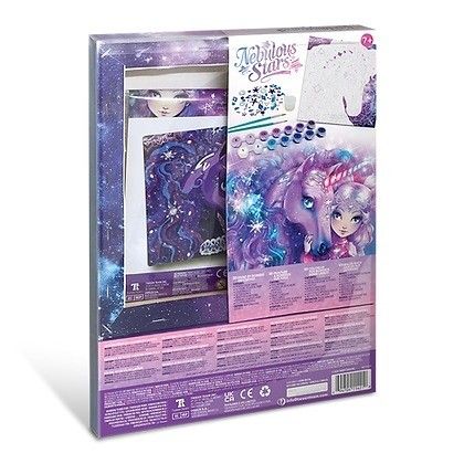 tištěné plátno s dřevěným rámem, malování podle čísla, potištěné barevné plátno, 14 akrylových barev, 2 štětce, třpytivý lak, kamínky, instrukce, příběh Nebulie