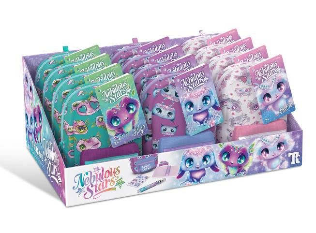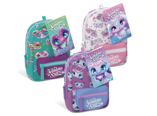 Nebulous Stars Mini baťůžek set. Rozměry 9x6x11 cm. Obsah - baťůžek, přívěšek, linkovaný notes, propiska, guma, nálepky. 12 ks display box. 3 varianty - modrá, bílá, fialová.