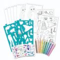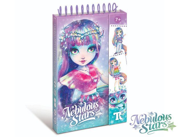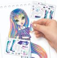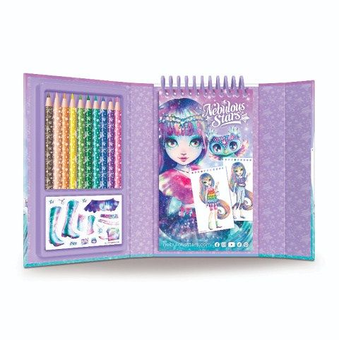 Nebulous Starts Návrhářský set na cesty . Rozměry 19,5x11x3 cm. Malý formát vhodný na cesty. Obsahuje 20 stránek s náčrtkem postavy, 2 stránky se šablonami pro oblečení (28 šablon). 6 archů se samolepkami (100 samolepek), 10 barevných pastelek, obrázkový návod. Display box 8 ks. Blok s magnetickým uzavíráním.