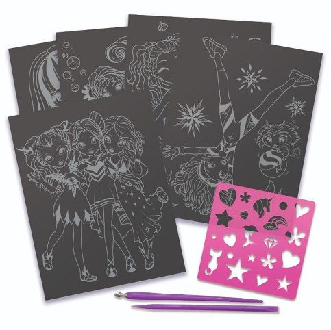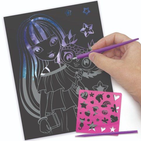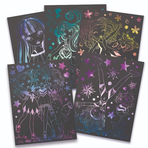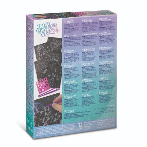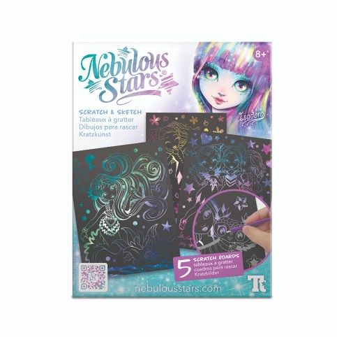 Nebulous Stars Vyškrabávací set. Obsah balení - 5 seškrabávacích destiček, 2 vyškrabávací nástroje, 21 šablon, návod a příběh Isadory.