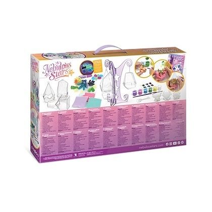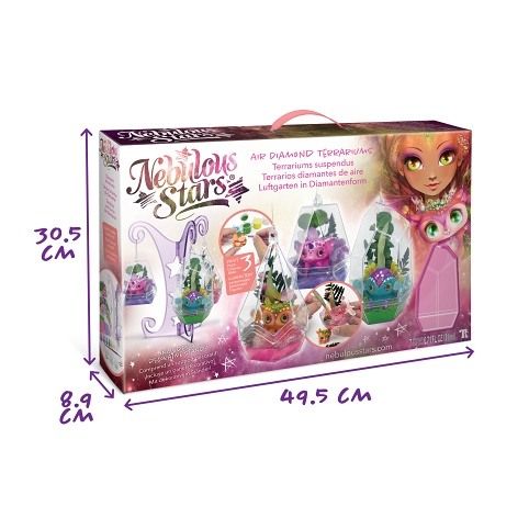 Nebulous Stars Vzdušná terária ve tvaru diamantu. Obsah balení: 3 terária ve tvaru diamantu, dekorativní stojánek, 3 postavičky k vybarvení, 6 akrylových barev, třpytivý lak, štětec, glitrová vysušená hlína, sušené květiny a listy, kovová nit, Hazeliin příběh, instrukce.