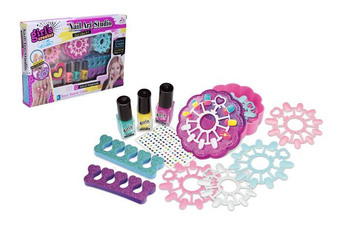 Nehtové studio. Obsahuje plastové nalepovací nehty, 3 barevné laky (snadno odstranitelné), dekorace.
