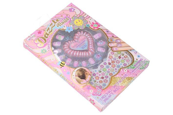 Nehty nalepovací s nálepkami - kytičky. Obsahuje nalepovací nehty, nálepky, gumičku do vlasů. Nehty po přitlačení drží, není potřeba lepidlo.