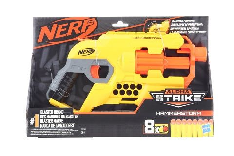 Hammerstorm je vynikající jednoruční odpalovací zařízení ze série Alpha Strike. Revolver je vybaven osmiranným rotačním zásobníkem Elite arrow. Odpalovač se nabíjí posunutím oranžového jazýčku spouště palcem a poté stačí stisknout spoušť a vystřelit. Odpalovací zařízení má dvě taktické lišty a rukojeť, kterou lze protáhnout popruh. Odpalovací zařízení má také bod pro upevnění hlavně. Pod zásobníkem je prostor pro uložení dalších osmi šípů, což vám dává výhodu nad soupeřem. S vystřelovačem obdržíte osm šípů. Rozměr balení cca 28 x 42 x 7 cm. Věk 8+