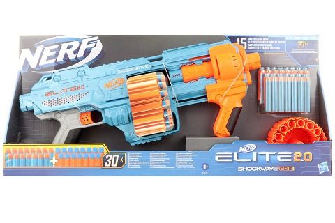 Bojujte novým blástrem NERF 2.0 Shockwave! Má rotační bubínek, který pojme 15 šipek. Zamiřte a vystřelte pouze 1 šipku nebo rychle vystřelte všech 15 šipek, abyste zvýšili svoji palebnou sílu. Tenhle akční blástr vystřeluje šipky až do vzdálenosti 27 metrů, proto se můžete rychle dostat do bitvy a převzít zde kontrolu! Včetně 30 šipek Elite. Rozměr balení cca 67 x 30 x 8 cm. Věk 8+