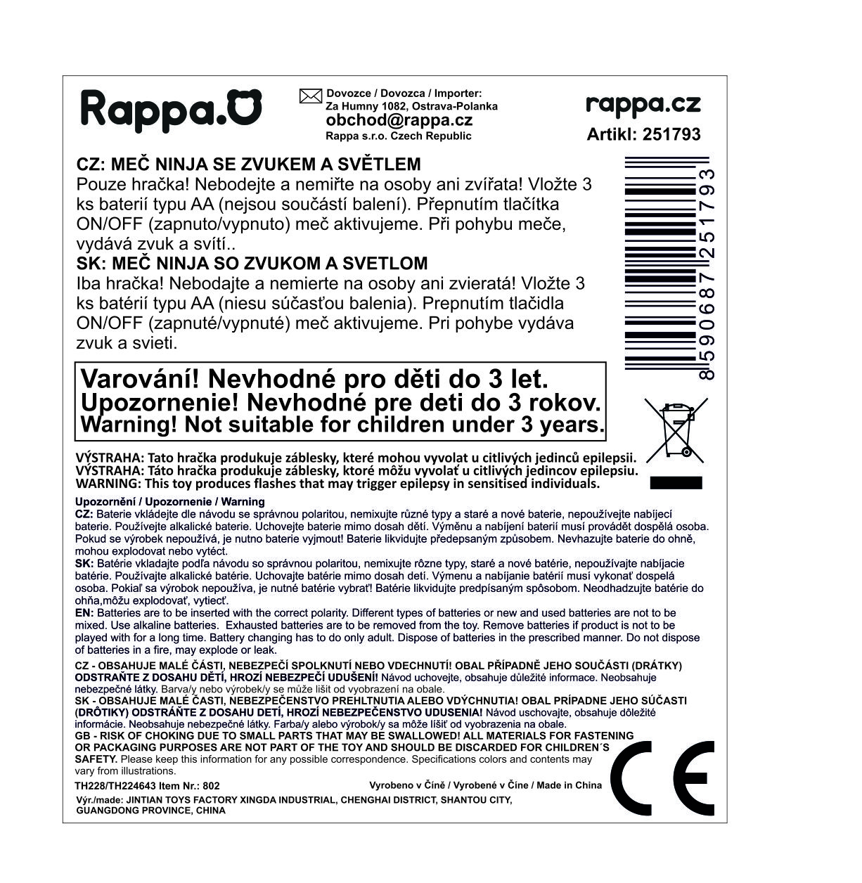 Ninja meč v délce 56 cm s pouzdrem je ideální doplněk pro malé bojovníky! Meč je na 3 baterie typu AA a po zapnutí vydává světelné a zvukové efekty, které oživí každou hru. Baterie nejsou součástí balení. Ideální pro karnevaly, domácí bitvy a hraní na hrdiny.