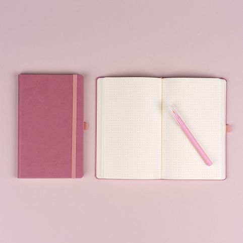 Praktický a lehký tečkovaný notes v trendy růžové barvě má povrch s jemnou strukturou, na který si můžete nechat vyrazit logo společnosti. Notes má pevnou knižní vazbu a zakulacené rohy, poutko na tužku, elastickou gumičku a textilní záložku. Tečky mají 5 mm a jsou na kvalitním žlutém papíře.