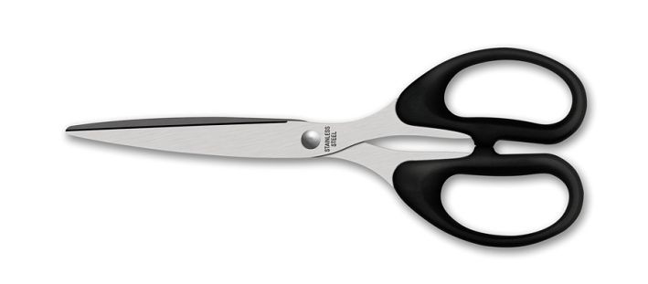 Univerzální kancelářské nůžky s ocelovými nožnicemi, dodávané v blistru.