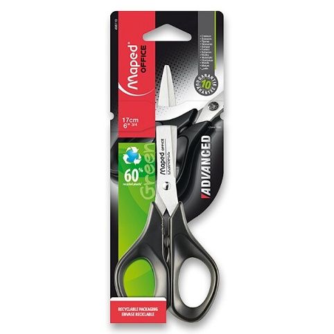 nůžky vyrobené ze 70 % z recyklovaného materiálu, velikost 17cm ** nože i nýt z nerezové oceli, symetrické ergonomické rukojeti