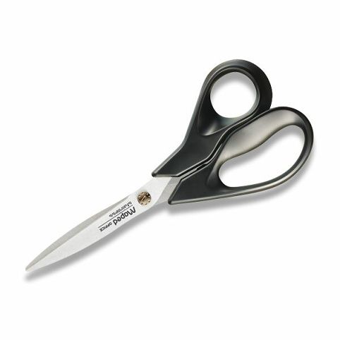 Nůžky vyrobené ze 70 % z recyklovaného materiálu, velikost 21 cm. Nože i nýt z nerezové oceli, asymetrické ergonomické rukojeti.