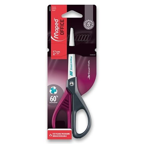 NůžkyMaped Essentials Metal Colours velikosti 17 cm mají rukojeť z 60% post-industriálního recyklovaného plastu. Nože a nýt jsou z nerezové oceli.