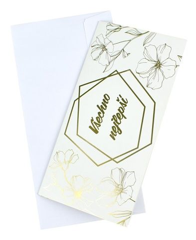 Tato obálka o rozměrech 10 x 19,5 cm je zdobena nádherným motivem bílozlatých květů, který dodává pocit luxusu a výjimečnosti. Nepotištěná část nabízí prostor pro napsání osobního blahopřání či zdravice. Perfektní pro svatby, výročí, nebo jako elegantní způsob, jak předat finanční dar k jakékoli speciální příležitosti.