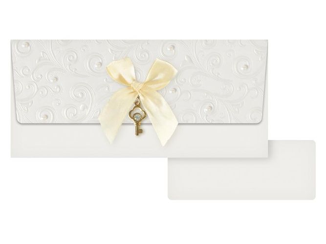 Dárková obálka na peníze pro novomanžele - Udělejte novomanželům radost a věnujte jim obálku s penězi nebo dárkovým poukazem. Uvnitř je kartička bez textu, na kterou můžete napsat věnování. PROVEDENÍ: béžová s mašlí a klíčem Uvedená cena je za 1 ks.