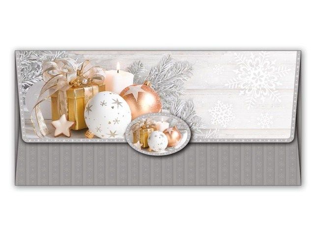 Dárková obálka na peníze s vánočním motivem a uzavíratelnou klopou - Darujte svým blízkým dárek k Vánocům v podobě obálky na peníze. Do obálky lze vložit peníze nebo dárkový poukaz. Uvnitř je kartička bez textu, na kterou můžete napsat věnování. PROVEDENÍ: šedo-bílá s vánoční výzdobou Uvedená cena je za 1 ks.