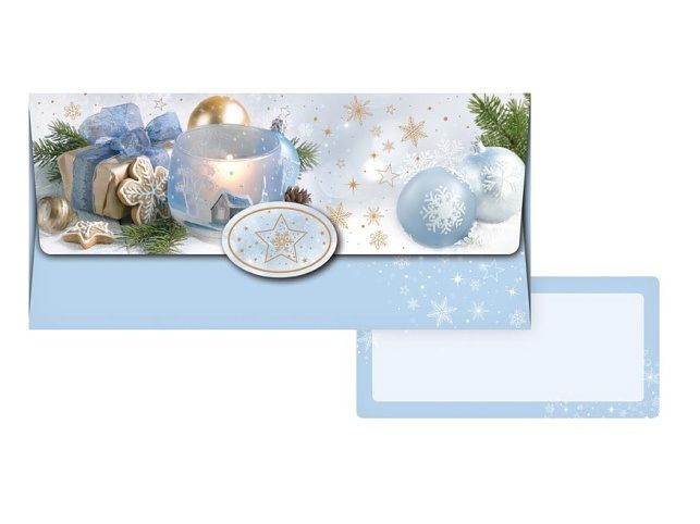 Dárková obálka na peníze s vánočním motivem a uzavíratelnou klopou. Darujte svým blízkým dárek k Vánocům v podobě obálky na peníze. Do obálky lze vložit peníze nebo dárkový poukaz. Uvnitř je kartička bez textu, na kterou můžete napsat věnování. BARVA: světle modrá / bílá MOTIV: vánoční Uvedená cena je za 1 ks.