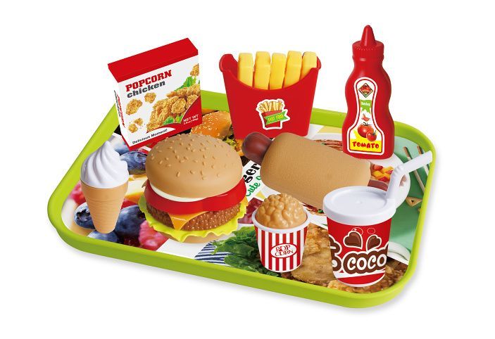 Občerstvení Fast Food s táckem. Součástí tácek, hamburger, hranolky, párek v rohlíku, zmrzlina, nápoj, kečup, kuřecí nugety, vidlička, nůž.