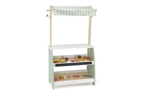 Dřevěný obchod s potravinami. Obsahuje obchůdek a 18 potravin. Rozměry balení cca 64x39x10 cm. Rozměry složeného obchůdku 104x57,5x30 cm. Věk 3+