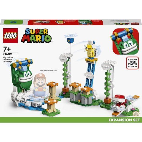 S rozšiřujícím setem LEGO® Super Mario™ Oblačná výzva s Velkým Spikem (71409) si děti mohou postavit vlastní herní úroveň v oblacích. Set obsahuje typické překážky z videoher Super Mario™ a 3 figurky LEGO známých protivníků – Velkého Spikea, Boomerang Broa a piraňovou rostlinu. Hráči mají za úkol pomoci LEGO® Mariovi, LEGO® Luigimu nebo LEGO® Peach™ (nejsou součástí setu) přemoci Velkého Spikea, dostat skokem z oranžových trampolín ve tvaru houby Boomerang Broa, získat akční kostku Super Star a mnoho dalšího. Jejich snaha bude odměněna bohatým množstvím digitálních mincí. (Poznámka: Pro plnohodnotný herní zážitek je vyžadován startovací set 71360, 71387 nebo 71403.)