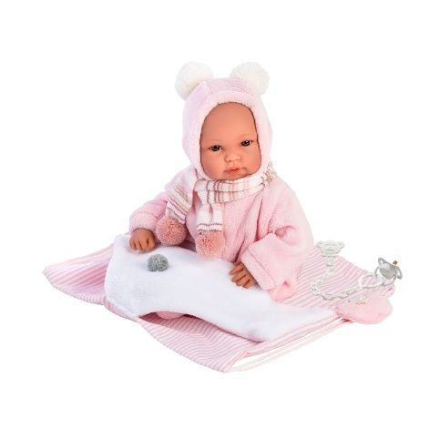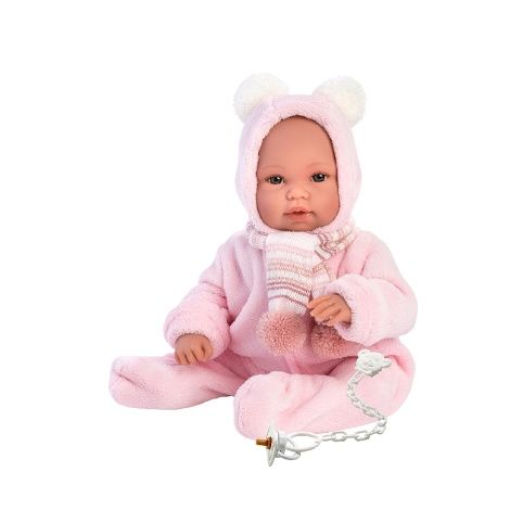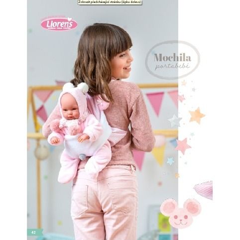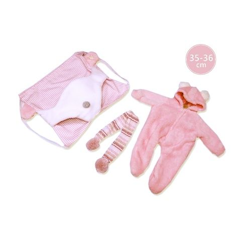 2dílný obleček s nosítkem, které je součástí batůžku pro panenku miminko NEW BORN Llorens velikosti 35-36 cm. Vyrobeno ve Španělsku, baleno v igelitovém obalu s plastovým nebo kartonovým ramínkem. Doporučený věk od 3 let.