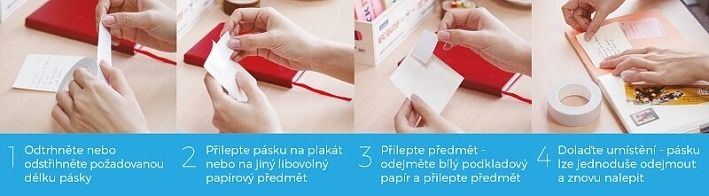 Silně lepicí oboustranná samolepicí páska s možností opakovaného použití. Vhodná na plakáty, fotografie, aranžování apod.