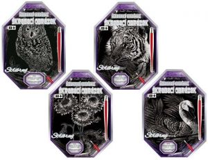 Vyškrabávací obrázek sova se stříbrným podkladem 30x21,5cm Balení obsahuje předtištěný obrázek 30x21,5cm a rydlo. NÁVOD: Odstraňte krycí fólii. Přiloženým rydlem seškrábejte předtištěný obrázek.