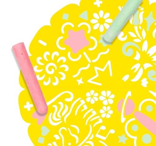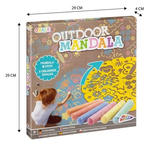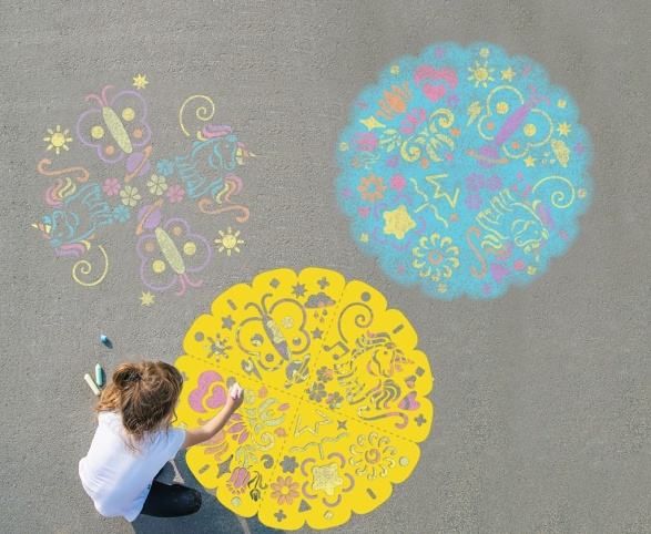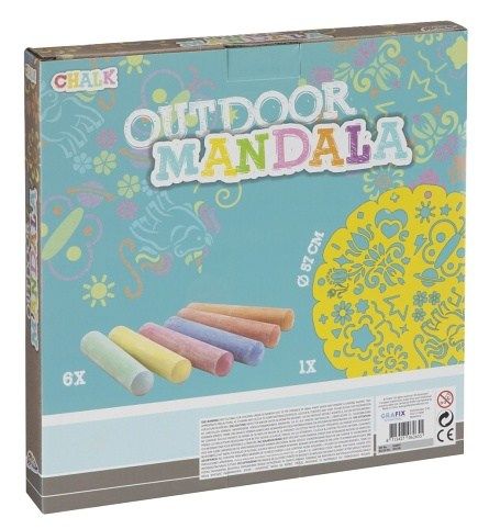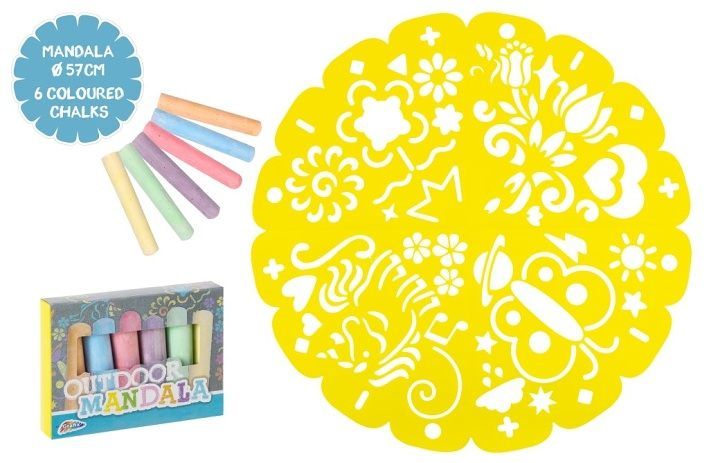 Obrázek Mandala s křídami venkovní – sada obsahuje 4 šablony, ze kterých lze složit obrázek o velikosti 57 cm + 6 barevných kříd. Venkovní použití na dlažbě, asfaltu atp.