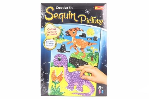 Sada obsahuje předlohu s motivem dinosaurů, sadu flitrových doplňků a hřebíčku pro snadnou aplikaci a ilustrovaný návod krok za krokem. Děti podle návodu nebo fantazie aplikují pomocí hřebíčku flitry na obrázek. Rozměr balení cca 24 x 33,5 x 5 cm. Věk 6+