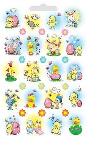 NávoD:Rozsřihněte aršík na jednotlivé obrázky. Doporučujeme obtisky namočit na několik vteřin do teplé vody a položit na desku nebo sklo k samostatnému provlhčení. Až se obtiskový papír narovná a obtiskem lze po papíru posouvat, posuntě jej k okraju papíru a podsunutím spodního papíru aplikujte na určeném místě. Hladkou stranou mokrého papírku vymáčkněte vodu a vzduchové bublinky, aby byl povrch obtisku hladký. V případě, že necháte obtisky dlouho ve vodě, odplave škrobová lepící vrstva a obtisk nemá dobrou přilnavost. Obtisk drží dobře a hladkých nepórovitých předmětech. Odstranit lze pouze seškrábnutím. Veselé velikonoce