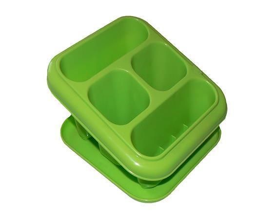 Plastový stojan na příbory s podtáckem. Šetří místo při sušení mokrého nádobí.