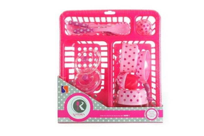 Plastový odkapávač s nádobím. Obsahuje hrnce, pánvičky, pokličky a další náčiní. Rozměry balení cca 28 x 30 x 7 cm.