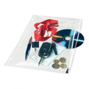Odkládací obal se zipem, vnitřní rozměr 30 x 18 cm, barevná spodní fólie a průhledná vrchní fólie, děrování na levé straně, PVC, mix barev