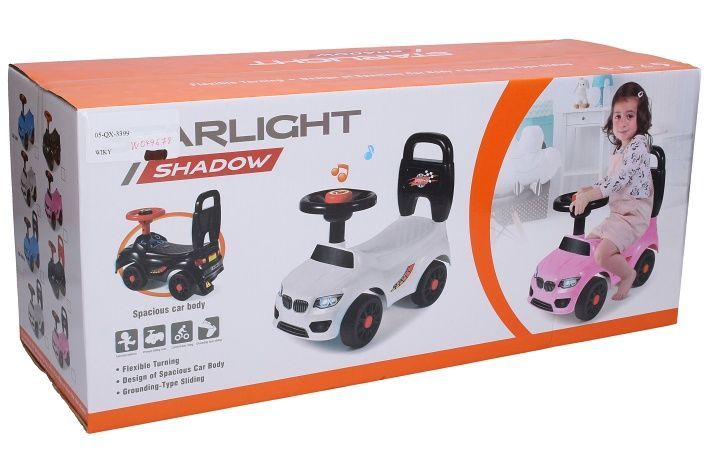 Odrážedlo bez opěradla bílé. Rozměry 50x21,5x33 cm. Nosnost 15 kg. Obrázkový návod na složení na spodní straně obalu.