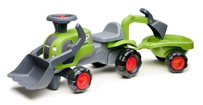 Odrážedlo Claas zelené s valníkem, přední lžící a zadní lžící. Součástí traktoru je klakson, valník, přední mechanicky a zadní mechanicky ovládaná lžíce. Z vysoce odolného a kvalitního plastu. Velikost 1+. Všechny traktory Falk jsou testovány na 30kg – dle požadavků evropských norem. Vyrobeno ve Francii.