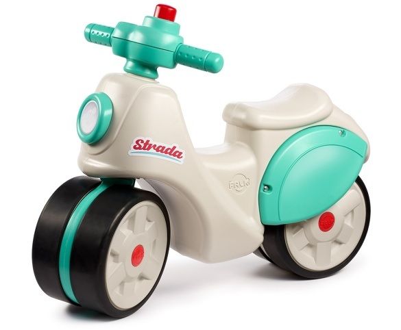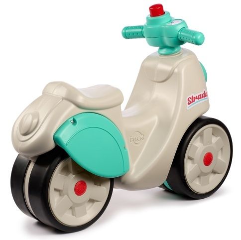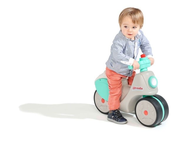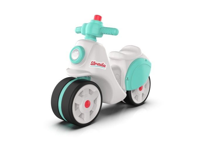 Odrážedlo skútr Strada bílo/modrý s klaksonem a tichými kolečky. Velikost 59×24×48 cm. Věk 1+. Všechna odrážedla jsou testována na 30kg – dle požadavků evropských norem. Vyrobeno ve Francii.