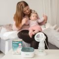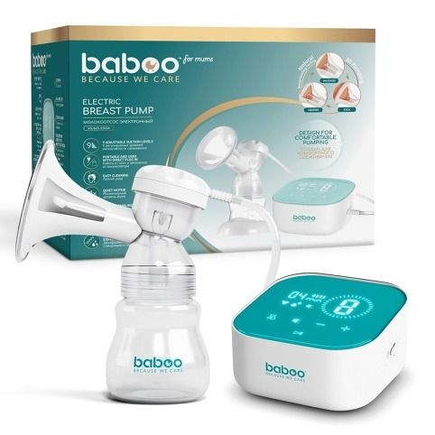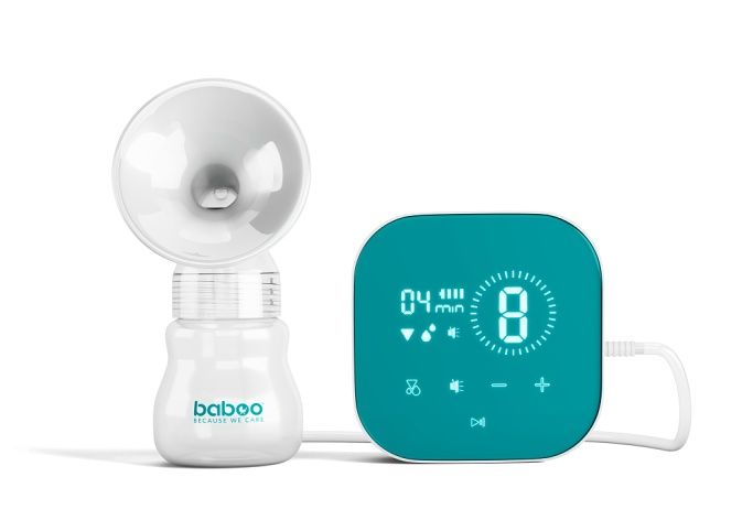 Odsávačka mateřského mléka Baboo elektrická – 2 fáze stimulačního režimu, 9 nastavitelných úrovní sání, bezhlučné odsávání mléka s další možností ztlumení, moderní design s dotykovým ovládáním, jednoduché ovládání funkcí jednou rukou, možno používat dvěmi způsoby, jak na baterie, tak i s připojením, velmi jednoduché sestavení a čištění, obsahuje nabíjecí baterie LI-ion, uzavíratelný systém opatřeným proti zpětnému odtoku, všechny součati neobsahují BPA. Balení obsahuje – 100% silikonovou podložku, AC adaptér, kabelový adapter, adaptér na láhev, víčko na láhev, konektor na láhev, kroužek na láhev, stojan na láhev, skaldovací pytlíky na mateřské mléko 3 ks, rsní vložky 4 ks, přenosný sáček, membráma, pracový kryt, láhev a návod. Na baterie: 1x 6,4V (je součástí balení)