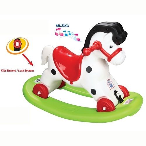 Houpací kůň s melodií.V houpadle pevně zafixován, při vyjmutí jezdí na kolečkách ! Velikostí vhodný pro mladší děti, rozměry 77×37×51 cm.