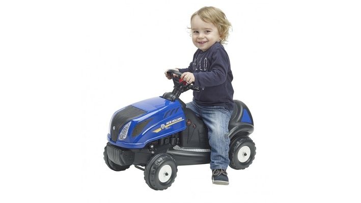 Odstrkovadlo New Holland modré s volantem a zvedací kapotou. Vyrobeno ve