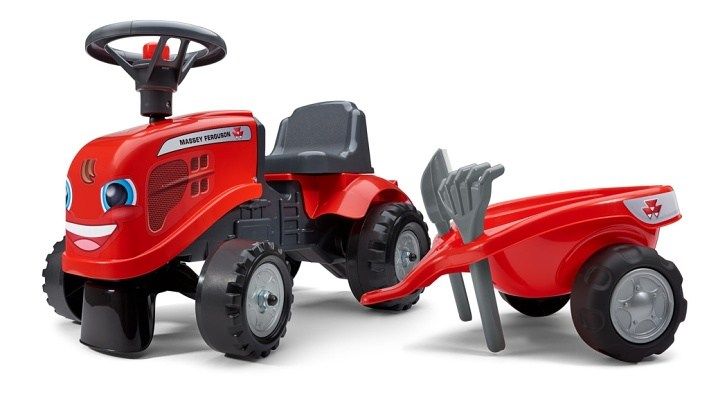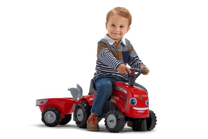 Odstrkovadlo – traktor Massey Ferguson s volantem a valníkem. Součástí valníku je lopatka a hrabičky. V balení jsou dvě sady samolepek na přední masku, můžete si vybrat polepky dle vlastní nálady. Vybeno ve Francii z vysoce oddoleného a kvalitního plastu. Testováno dle evropských norem na hnotnost 50 kg. Rozměry odrážedla 91×34×37 cm.